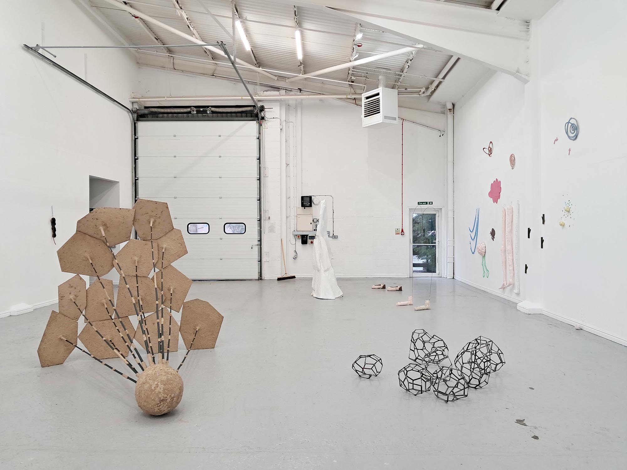 Between the Floor and the Wall presents the work of seven artists whose work oscillates between the flat and the fat; the horizontal and the vertical. Their diverse artistic outputs share an excitement about playing with spaces and meaning throughout the zone between the floor and the wall, bringing energy and humour to this project at Thames-Side Studios Gallery. The exhibition includes works made with diverse, experimental and sustainable approaches to textiles, sculpture, ceramics and found materials. About the artists: Eleanor Bedlow works in between the disciplines of drawing, painting and sculpture, pairing tactile and organic forms in works that feel as though they are exploring, leaning, feeling, listening. @eleanorbedlow Johanna Bolton works across sculpture, installation and performance, engaging with complexity and the unknowable, and imprints of human presence in everyday objects and material encounters. @johanna.bolton Jenny Camp practices sculptural auto-cannibalism, physically making things out of desire and necessity but then frequently chopping up, adding to, or breaking down older pieces, mining them as material for new work. @jennyscamp_ Pattern, repetition and rhythm are central to Janet Currier’s installation with sculpture, drawing and painting, where scraps of well-worn garments worked into her sculptures, and invented wallpaper denote the domestic space; vulnerability, care and resilience. @janetdcurrier Sandra Lane works feelings of ambivalence, optimism and failure into multiple forms made from malleable materials, exploring memories, how to be a female and the absurd. In new edible and wearable works she enjoys pushing against the limits of sculpture, as much as the materials themselves. @artysandralane Jonathan McCree works with drawing, painting, sculpture, film and performance, as a record of movement and emotion through space. His playful, experimental practice pushes the boundaries of architecture, exploring spatial ideas and qualities. @jonathanmccree Jane Millar works with ceramics, wall painting and installation. The narrative emerges from the chaotic zone between our perceived inside and outside; a place of becoming and repurposing, of remnants of objects, mythologies, and a future speculation of a cosmos. @jmillarstudio Thames-Side Studios Gallery Thames-Side Studios Harrington Way, Warspite Road Royal Borough of Greenwich London SE18 5NR For general Thames-Side Studios Gallery enquiries please email info@thames-sidestudios.co.uk Disabled access. Free, limited parking is available on site. How to get here: Bicycle: Thames River cycle path (16 mins cycle from Greenwich). Bus: 161 / 177 / 180 / 472 to Warspite Road bus stop. DLR: Woolwich Arsenal (1 minute walk to Plumstead Road and take Route Bus 177 towards Peckham Bus Station or 472 towards North Greenwich Station). Road: A2 corridor, first roundabout east of Thames Barrier onto Warspite Road. Train: From Cannon Street or London Bridge to Woolwich Dockyard (8 minute walk) or Charlton (12 minute walk). Tube: North Greenwich (Take the Route Bus 472 towards Thamesmead Town Centre). Crossrail: Elizabeth Line to Woolwich (take Route Bus 177 towards Peckham Bus Station or 472 towards North Greenwich Station).