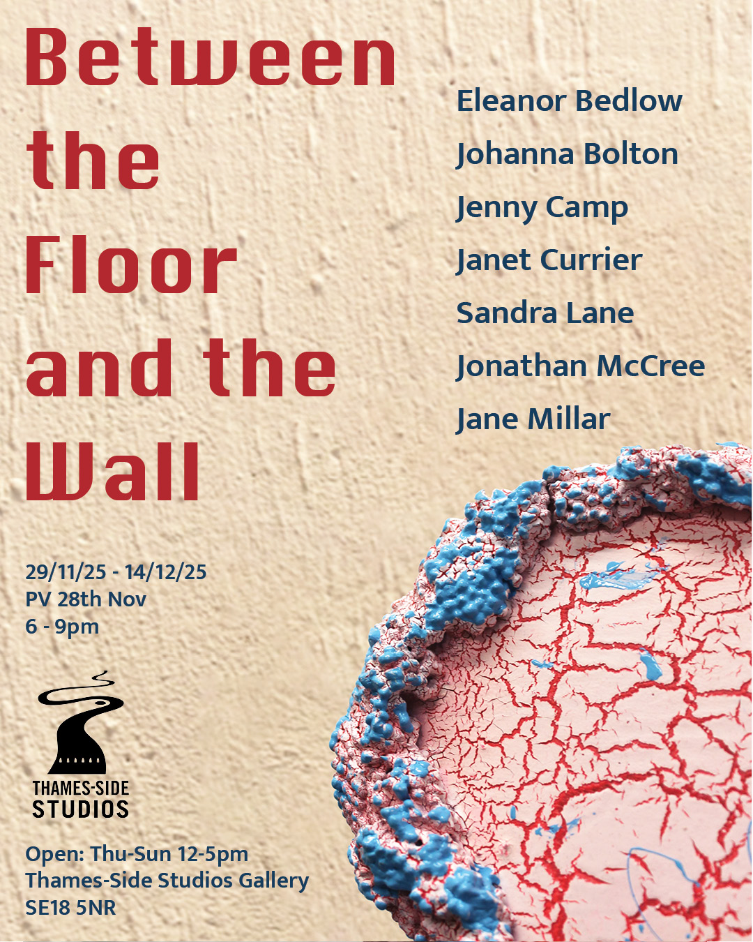 Between the Floor and the Wall presents the work of seven artists whose work oscillates between the flat and the fat; the horizontal and the vertical. Their diverse artistic outputs share an excitement about playing with spaces and meaning throughout the zone between the floor and the wall, bringing energy and humour to this project at Thames-Side Studios Gallery. The exhibition includes works made with diverse, experimental and sustainable approaches to textiles, sculpture, ceramics and found materials.