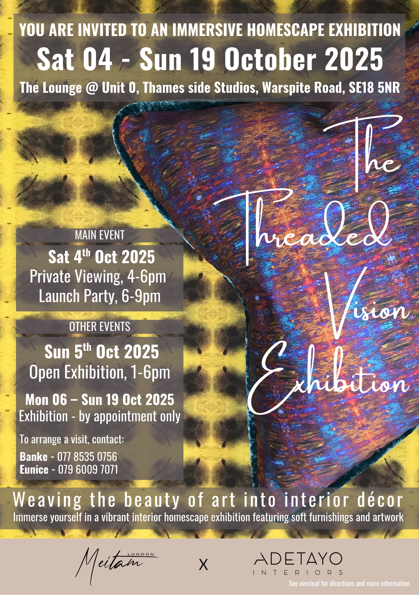 Join Meitam London and Adetayo Interiors for the immersive Threaded Vision Exhibition. This innovative home-scape exhibition showcases the transformation of Meitam London's contemporary and surreal artwork into fabrics, which in turn, have been crafted into interior décor pieces made by Adetayo Interiors. A fusion of art, design and soft furnishings; cushions, blinds, curtains and small upholstered items are displayed in the interior settings, illustrating how vibrant colours, textures and patterns can be utilised to create a sense of fun, comfort and beauty in a space. About the Collaborators: Meitam London – Eunice Bossman Okai (Studio 5-122) is a contemporary abstract artist working primarily with natural African materials to explore themes of culture, environment, and identity. Her work is deeply rooted in tradition, using organic elements such as fruits and vegetables - materials rich in cultural and symbolic meaning. Embedded into her paintings, these choices are not only aesthetic but intentional, connecting her practice to heritage and lived experience. Eunice’s art often takes the form of mixed media, drawing influence from nature and environmental change. Issues like pollution and ecological imbalance shape the textures, forms, and colours she creates. She’s drawn to materials that carry their own narrative - organic, raw, and textural substances that reflect both the beauty and fragility of the natural world. A fusion of abstraction, cultural memory and environmental awareness, Meitam London’s works invite viewers to reflect on the relationship between humanity, tradition, and spaces we inhabit. Each piece becomes a dialogue between material, meaning, and message - honouring both past and present. Adetayo Interiors – Banke Adetayo (Studio 0-248) is a trained interior designer who offers a highly personalised bespoke service that aims to help you fall in love with your space. No matter your taste or style, she works together with clients to create something truly unique and beautiful. Functionality, harmony and beauty are the hallmark of Banke’s work, whether designing or hand crafting unique pieces for your spaces. Banke’s early professional background weaves together over 15 years in the study of the human condition, project management and quality assurance in the international development sector. Banke then decided to pursued her dreams and fuse all her range and depth of experience with her passion for creativity and design. Gaining a Certificate in Residential Interior Design at the KLC School of Design, Banke has gone on to freelance with Interiorise Ltd. an interior design company and has worked on personal interior design projects for a range of clients. In 2025 she started her own studio, blending her love for design and creating special sewn pieces, including cushions, curtains and upholstered furniture. For more details on the exhibition, please get in touch with Banke on 07785 350 756 and Eunice on 07939 478 259 and follow on Instagram @adetayo.interiors and @meitam_London. Thames-Side Studios Lounge is located on the second floor of Unit 0 and open to all studio holders and by appointment. For non-studio holders please DM the artists to arrange an appointment.
