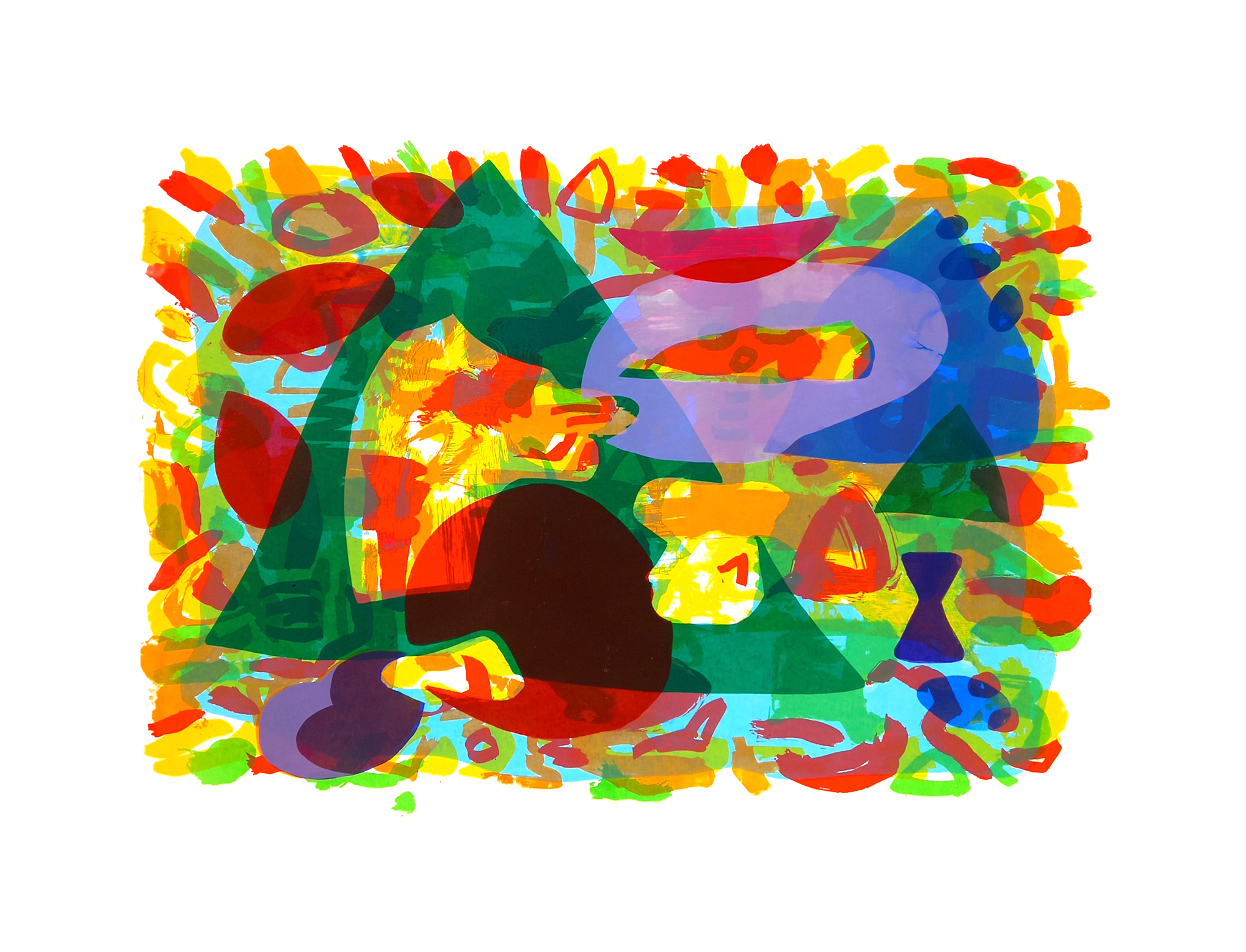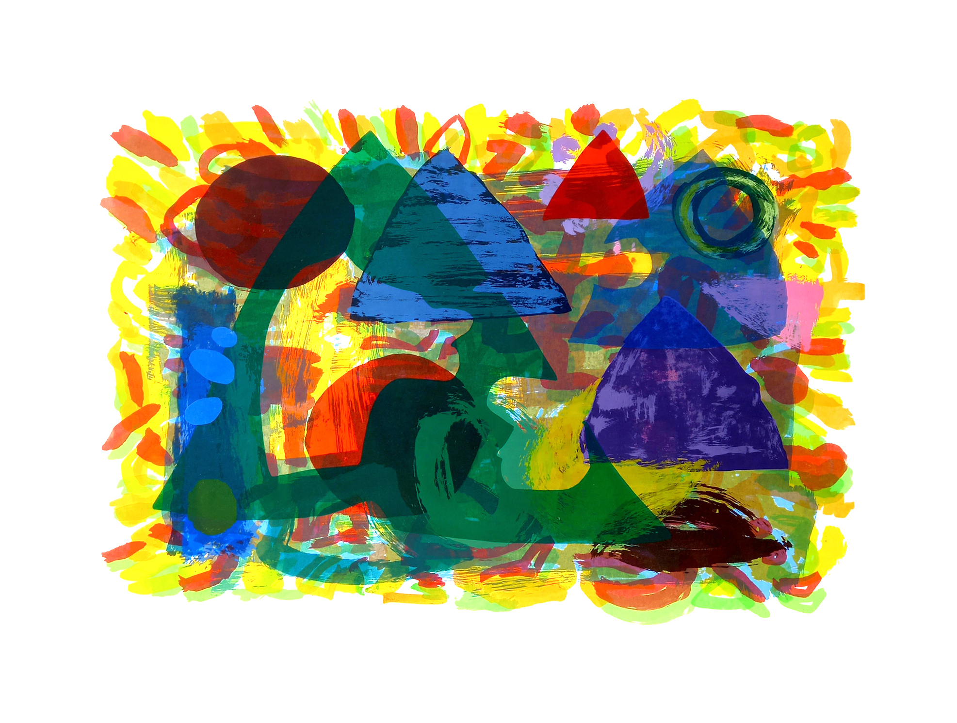 Joan Miro, John Hoyland, Bert Irvin and A. R. Penck, artists I liked at the time, had been influences during this period. I have treated screenprinting as an abstract fine artist would starting with random, chaotic shapes and colours and gradually adding more refined and considered elements to arrive at a final composition. I have created stencils that explore both opaqueness and transparency by adjusting the amount of acrylic medium used. Also, by mixing hard edged shapes with more freeform brushed edges.