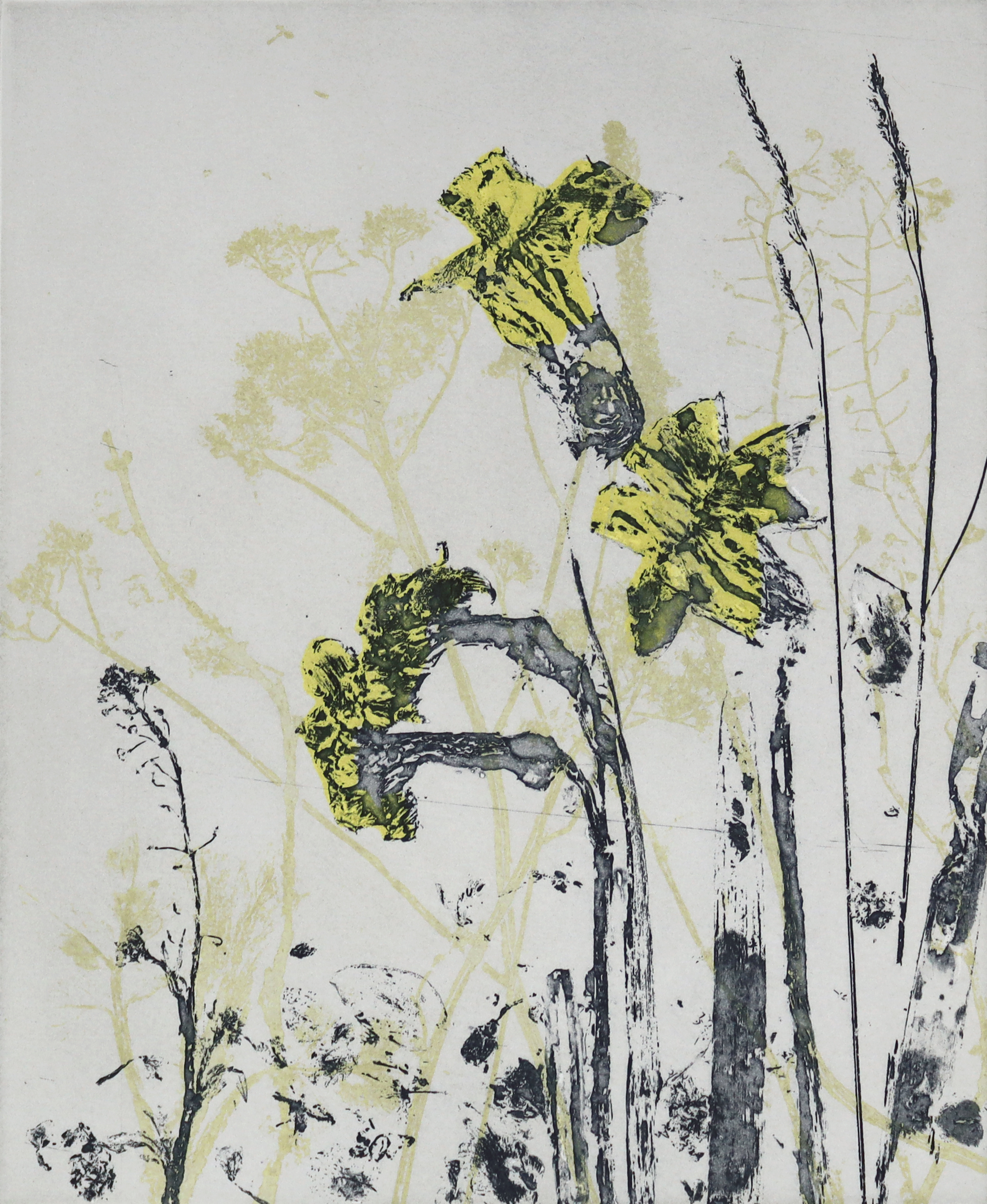 Thames-side Print Studio is proud to present her newest body of work, ‘Improvisations’. Plant matter collected during her daily commute along the Thames Path is deeply etched into large steel plates using acrylic grounds and saline sulphate solution. The plates are printed in small editions, and then form a library of imagery, surface and texture that can be used over and over again. These improvisations are developed directly on the press and result in unique prints in sequence, a composition that is practiced and changed with each performance, akin to music as much as art.