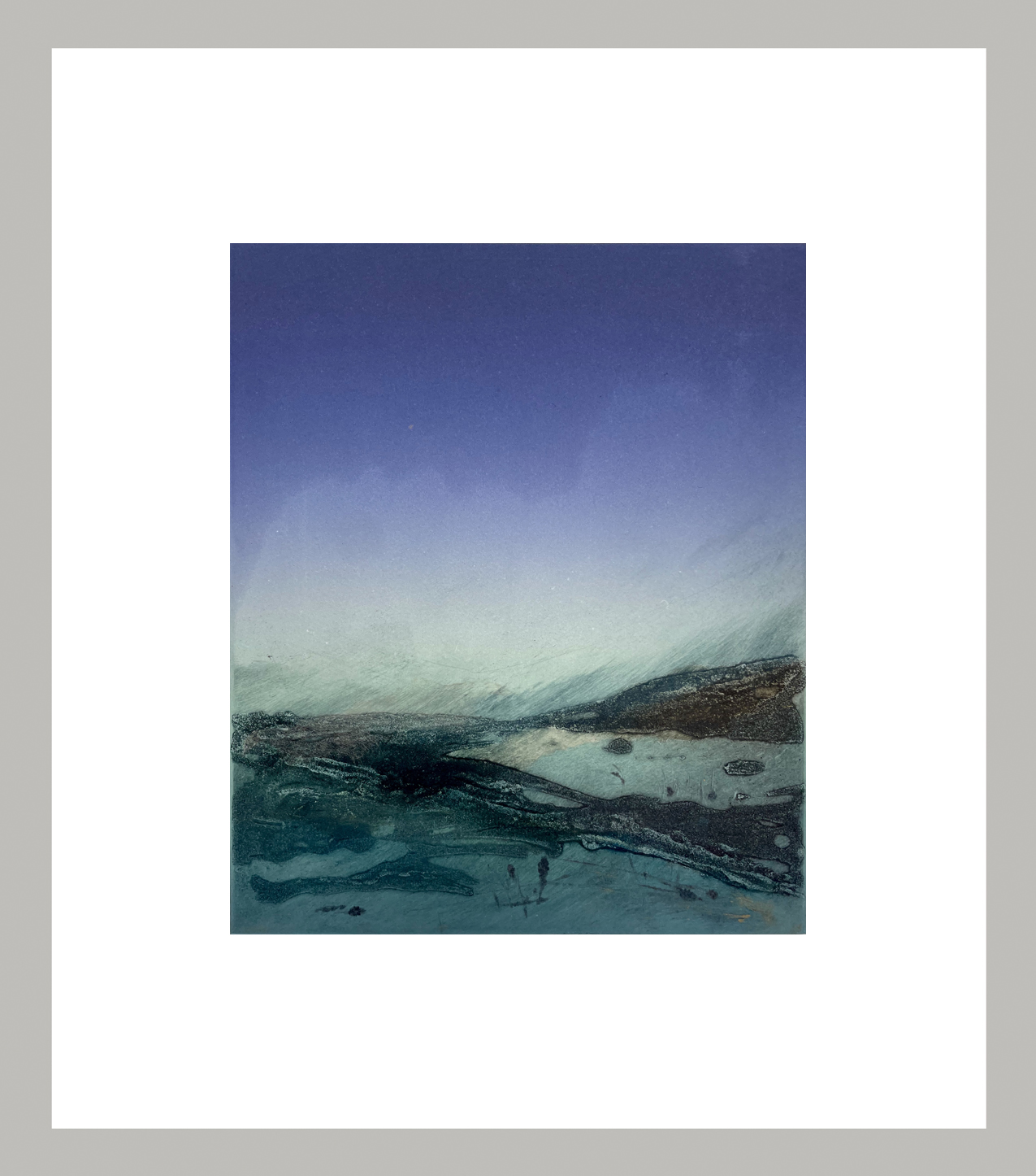 She uses various printing techniques which allow her to explore rich textures, shapes and nuanced colours. Every print she creates is unique as she uses multiple layers of hand mixed colours and torn pieces of paper on each print.
