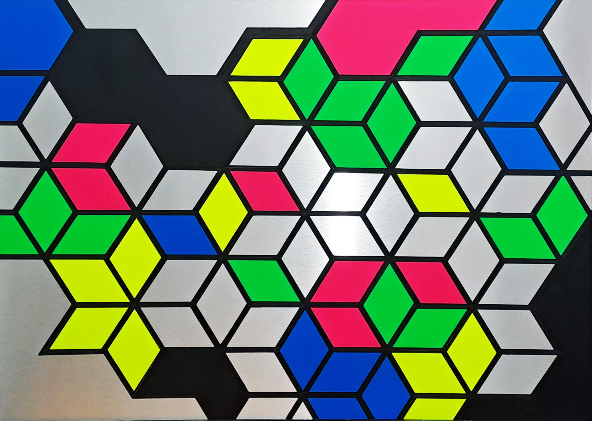 Ben’s artwork is heavily influenced by music. The main style that he works in was created when attempting to visualise the music genre Chiptune. Unnatural colours are his interpretation of the computer-like notes. Held together by hard, straight, black lines are how he sees the beat. Most pieces take their title from lyrics of tunes playing during the creative process of that artwork. Other influences include architecture (particularly Brutalism), stained glass, retro video games, early 00s Emo/Skate/Punk cultures, and art movements such as Cubism, Pop Art, Street Art, Minimalism, and De Stijl.