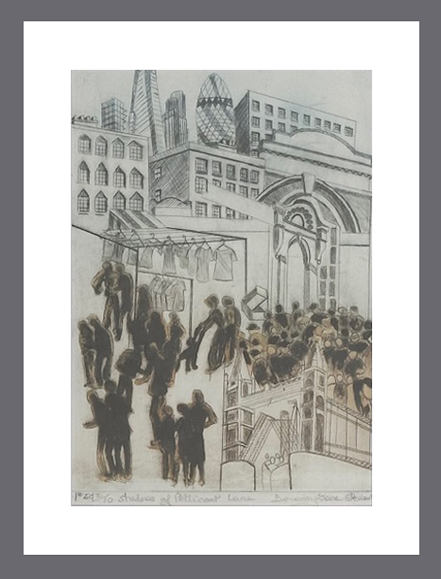 Guided by the question, “If I am only for myself, what am I?” (Hillel, 10 BC), she explored urban landscapes, particularly places of worship and docks—sites of migration and social change. Stewart highlights the immigrant struggle with displacement, cultural shifts, and stereotypes, drawing from her family history and teaching in London’s diverse schools.