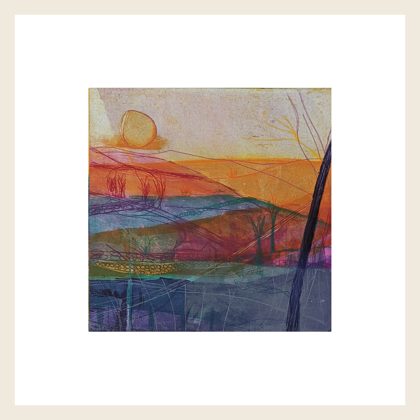 Louise’s prints and paintings are primarily concerned with the landscape. Some are based on childhood memories, reflecting on the countryside and coast of the west of England where she spent her early childhood. However some of the prints are created from small paintings and drawings made on location in sketchbooks.