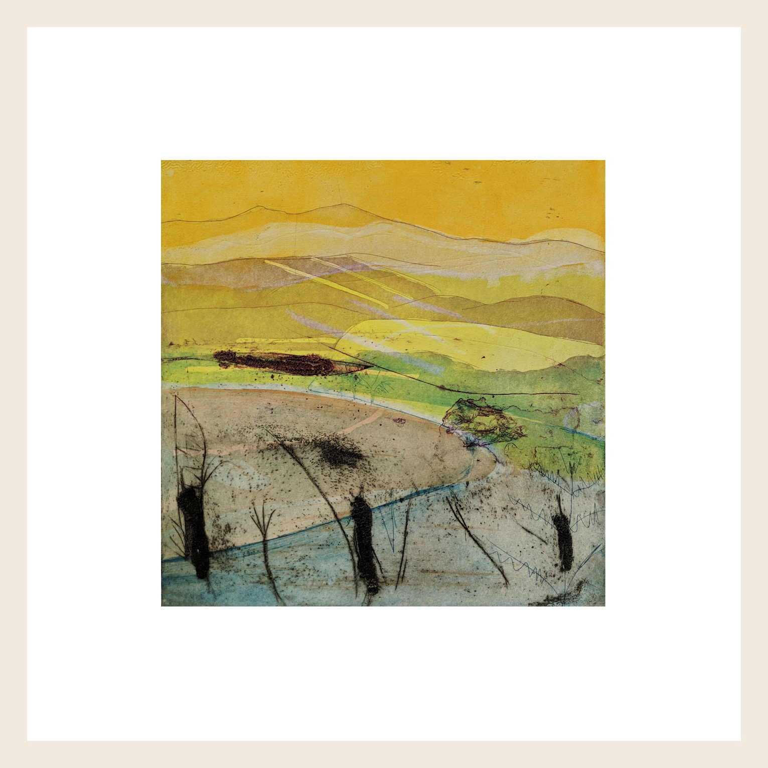 Louise’s prints and paintings are primarily concerned with the landscape. Some are based on childhood memories, reflecting on the countryside and coast of the west of England where she spent her early childhood. However some of the prints are created from small paintings and drawings made on location in sketchbooks.