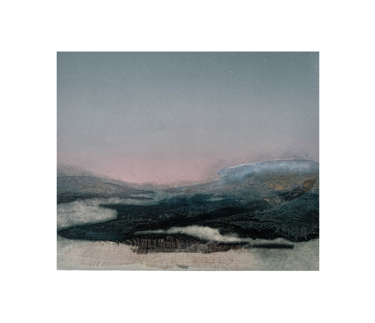 She uses various printing techniques which allow her to explore rich textures, shapes and nuanced colours. Every print she creates is unique as she uses multiple layers of hand mixed colours and torn pieces of paper on each print.