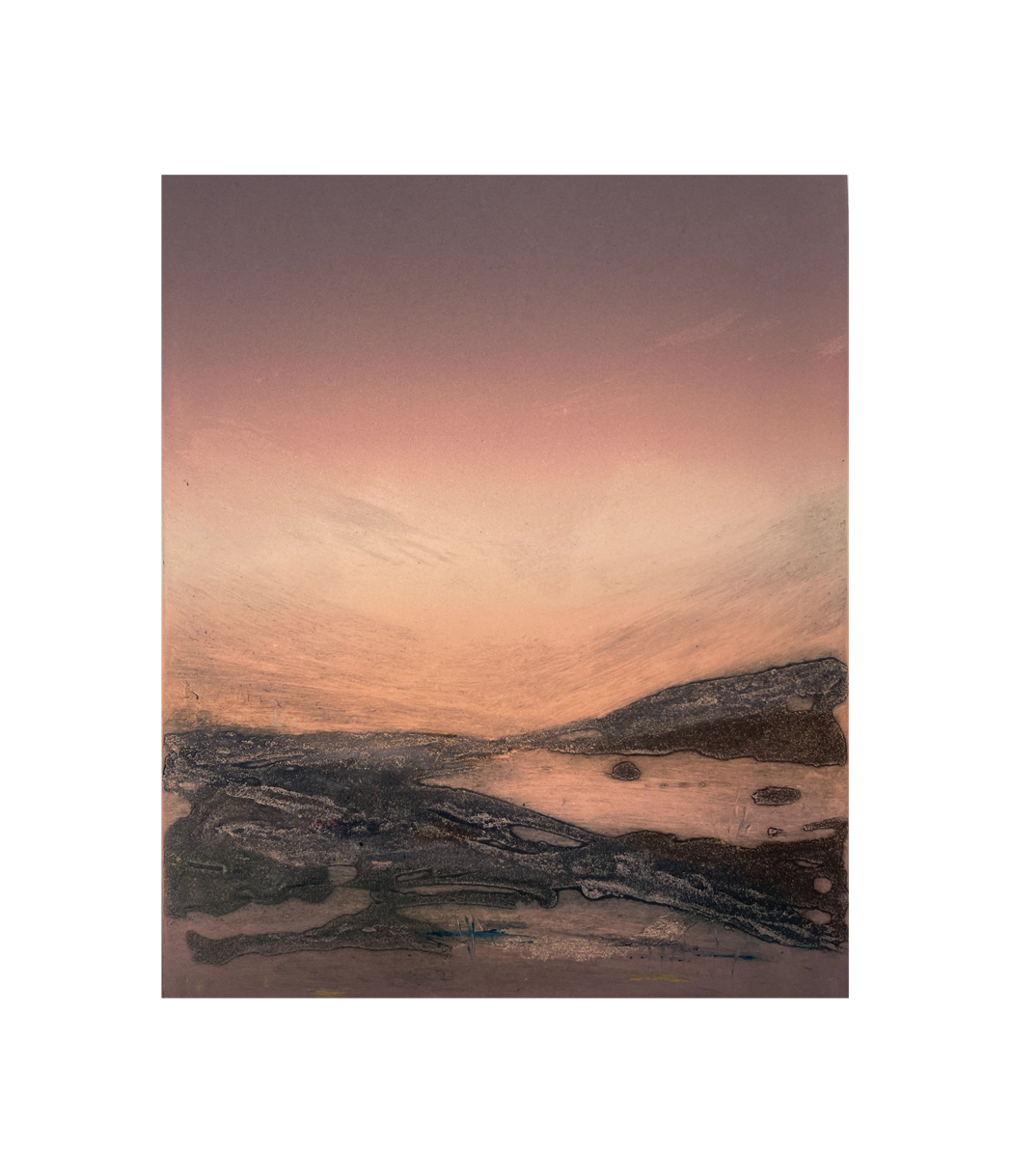 She uses various printing techniques which allow her to explore rich textures, shapes and nuanced colours. Every print she creates is unique as she uses multiple layers of hand mixed colours and torn pieces of paper on each print.